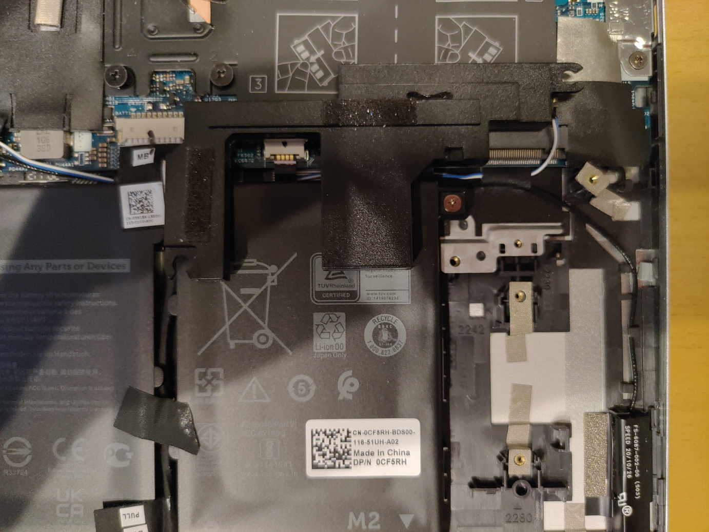 いきなり加工後画像だけど、SSDを一回挿してスピーカーを戻すとどこが当たるか分かるので一部削ります。今回はビニール袋をPCに被せて保護してからリューターで削りました。